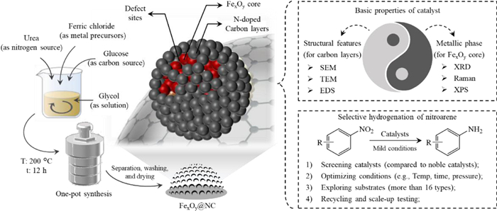 In the present work, we developed a simplified method for the preparation of FexOy nanoparticles coated by the N-doped carbon layers (FexOy@NC) in one-pot synthesis, where the experimental procedure and the subsequent application are depicted in Fig. 1. Generally speaking, the iron oxides in this catalytic system are decorated with layers of N-doped carbon that derived from the hydrothermal processes of glucose (as carbon source) and urea (mostly as nitrogen source); so, the formation of carbonaceous supports and the combination of metallic oxides are occurred concurrently. In addition, the thickness and porosity of N-doped carbon layers can be adjusted by varying the usage of glucose during hydrothermal carbonization, thereby controlling the catalytic properties of catalyst and exhibiting new insights in the processing mechanism. Thus, several techniques are employed to analyze the basic properties of catalysts (named as FexOy@NC-x, where "x" represents the usage of glucose), following by the selective hydrogenation of nitroarenes.