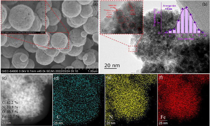| Fig. 2. The SEM (a), TEM (b) and EDS (c–f) results of FexOy@NC-0.2g catalyst. | |