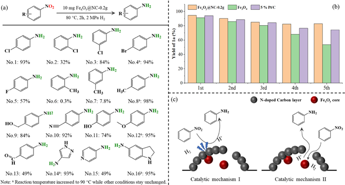 | Fig. 4. (a) The selective hydrogenation of functional nitroarenes catalyzed by the FexOy@NC-0.2g; (b) The recycling test of the FexOy@NC-0.2g and commercial catalysts; (c) The catalytic mechanism of hydrogenation over the FexOy@NC-0.2g. | |