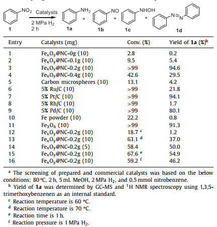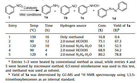 Table 1 Selection hydrogenation of nitrobenzene over different catalysts and conditions. |