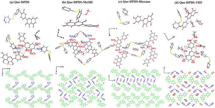 | Fig. 2. The asymmetric units, hydrogen bond motifs, and packing modes of the crystal structures in (a) Qur-DPDS, (b) Qur-DPDS-MeOH, (c) Qur-DPDS-Dioxane and (d) Qur-DPDS-THF. | |