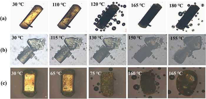 | Fig. 3. HSM images for (a) Qur-DPDS-MeOH, (b) Qur-DPDS-Dioxane, (c) Qur-DPDSTHF. | |