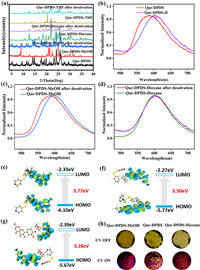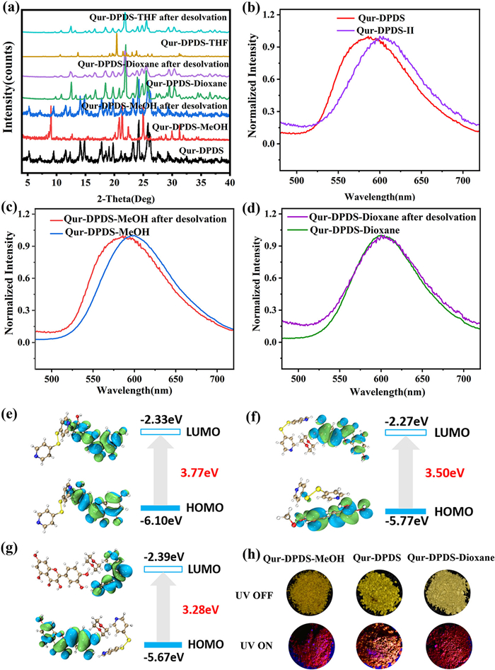 | Fig. 4. (a) PXRD patterns of the desolvation process of three Qur-DPDS cocrystal solvates, and normalized fluorescence spectra of (b) Qur-DPDS, Qur-DPDS-Ⅱ (c) QurDPDS-MeOH, Qur-DPDS and (d) Qur-DPDS-Dioxane, Qur-DPDS-Ⅱ, and molecular orbital diagrams and isodensity surface plots of the HOMOs and LUMOs of (e) QurDPDS, (f) Qur-DPDS-MeOH, (g) Qur-DPDS-Dioxane in their ground states, (h) photos of Qur-DPDS, Qur-DPDS-MeOH, and Qur-DPDS-Dioxane under visible light and 365 UV. | |