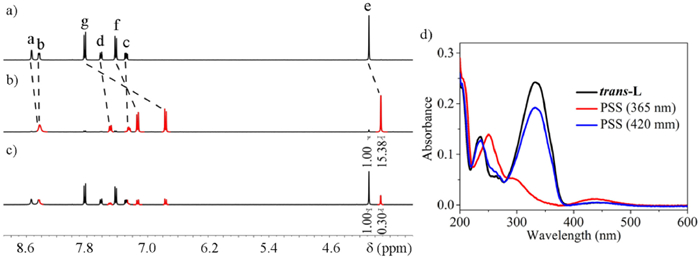 | Fig. 2. 1H NMR (400 MHz, CD3CN) spectra of (a) trans-L, (b) the irradiation of the solution (a) at 365 nm for 5 min, (c) the irradiation of the solution (b) at 420 nm for 5 min (black represents trans-L and red represents cis-L). (d) UV-vis absorption spectra of L. | |