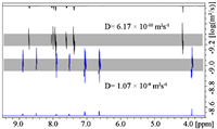 | Fig. 4. Overlaid 1H DOSY NMR (600 MHz, CD3CN) spectra of [Pd2(trans-L)4](BF4)4 and [Pd(cis-L)2](BF4)2 (black represents Pd2(trans-L)4](BF4)4, and blue represents [Pd(cis-L)2](BF4)2). | |