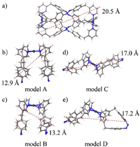 | Fig. 5. DFT-optimized structure and the longest diameter calculated for (a) [Pd2(trans-L)4](BF4)4 and (b) model A of [Pd(cis-L)2](BF4)2, (c) model B of [Pd(cis-L)2](BF4)2, (d) model C of [Pd(cis-L)2](BF4)2, (e) model D of [Pd(cis-L)2](BF4)2. | |