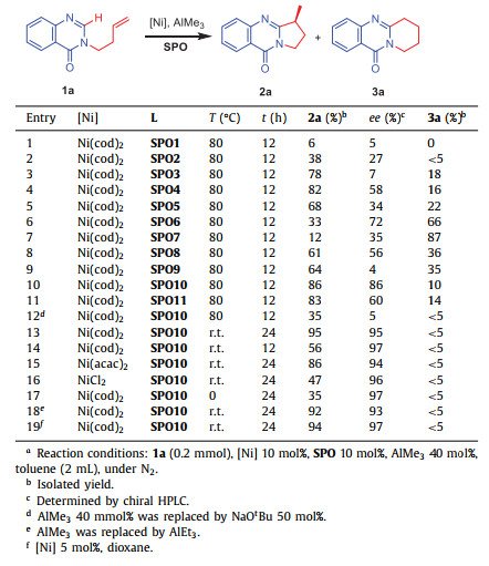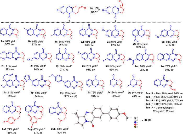 Under the above optimized reaction conditions, the reaction was further extended to a series of substrates with functional groups at different sites to test the generality (Scheme 3). Substituent effect of monoalkene-tethered 4-oxoquinazoline was first investigated. When the substituents were electron donor groups (2b-2h, 2o), there is less influence on the yield and ee value of the product. The reactions provided the corresponding products in 71%–95% yields and 86%-99% ee. For the substrates with electron-withdrawing substituents, such as CF3, F and ester groups (2i-2m), the reaction activity became poor under the standard conditions. After further optimizing the conditions, acceptable yields were obtained, and the ee values also remained at a high level. For some substrates with large π conjugated groups, reaction results were still good enough under the corresponding conditions to provide 2n, 2p and 2q in 77%–93% yields and 90%–96% ee. Notably, when an additional 6-alkenyloxy substituent was introduced into the skeleton, the enantioselectivity remained excellent (2o) despite a decrease in reactivity. It is speculated that the additional alkenyl group might participate in the coordination competition of Ni, resulting in the reduction of catalytic activity.