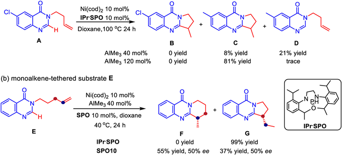 It is also worth noting that the reaction did not proceed as expected when the benzene ring of the substrate contains halogen groups such as Cl and Br. After further exploration (Scheme 4a), it was revealed that the exact reason is that the Cl group became active and was preferentially replaced by methyl group from AlMe3 under the catalysis of IPr. So the corresponding products are C and D, not B. In order to obtain a product with a larger ring, substrate E with a longer N-substituted olefin chain was also tried, but the experimental result were not consistent with our design (Scheme 4b). An interesting phenomenon was noted that the hydrogen of olefin migrated and a five-membered ring product G was finally generated with almost 100% conversion when achiral ligand IPr was used for the catalysis. Replacing IPr with chiral SPO10, however, the five-membered ring product G and the six-membered ring product F coexisted with moderate ee values. This shows that the structure of the ligand affect the regioselectivity of the reaction significantly.