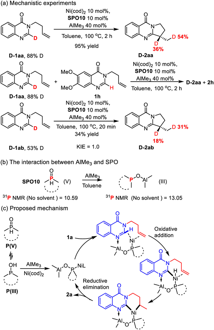 To understand the mechanism, the deuterated substrate D-1aa (88% D) of 1a was prepared from deuterated material (Scheme 5a). In the complete reaction of D-1aa, 54% of deuterium was transferred to the terminal carbon of the alkene moiety, and 36% of deuterium was added to the intermediate carbon atom of the ene. A competitive experiment between D-1aa and 1h revealed that there was no deuterium scrambling distribution. In addition, no significant kinetic isotope effect was observed in the competitive experiment (KIE = 1.0). In order to verify whether SPO has valence change, 31P NMR of SPO10 was identified (Scheme 5b). It was found that the chemical shift of 31P NMR changed from 10.59 ppm to 13.05 ppm after adding AlMe3. This shows that SPO and AlMe3 indeed interact to change the valence state of phosphine, and then SPO-AlMe2 coordinate with nickel [46]. On the basis of our experimental exploration and references [46,50,55], a possibly plausible catalytic cycle is presented (Scheme 5c). First, phosphine oxide is converted into trivalent phosphine under the activation of AlMe3, which then forms a complex with Ni. Al coordinates with the sp2-N atom of the substrate to help the location, then Ni carries out oxidative addition and reductive elimination through the conventional C-H activation steps to generate products. Chiral SPO acts as a ligand and plays a role in chiral induction.