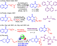 Quinazolinone ring skeleton widely exists in natural products and drug molecules. Quinazolinones shows good biological activities in anti-tumor, antibacterial, anti-inflammatory and antihypertension. Similarly, 4-oxoquinazoline natural products are also used as privileged motifs in drug research due to their diverse pharmacological activities (Fig. 1) [1-5]. The synthetic methods of quinazoline have been reported by many researchers [6-10]. However, there are few reports on the simple synthesis of polycyclic quinazolines, especially chiral ones [11-13]. Recently, some research groups attempted to develop methods for the synthesis of tricyclic pyroquinazolone compounds using 4-oxoquinazoline-tethered alkenes or functional group-substituted alkyl chain [14-20]. Notably, in 2021, Dong's group [14] reported a deacylation-aided C–H alkylative annulation of arenes or heteroarenes, in which tricyclic pyroquinazolones were provided in moderate yields (Scheme 1a). Procter [15] disclosed an enantioselective copper-catalyzed borylative cyclization for the assembly of privileged pyroquinazolone motifs (Scheme 1b). Very recently, Wu [16], Jin [17,18], He [19] reported a similar photocatalytic synthesis for polycyclic pyroquinazolones (Scheme 1c). Though there are many ways to prepare achiral or racemic products, few enantioselective synthetic methods could be extended to multifunctionalization of pyroquinazolone scaffolds [21-23]. Enantiomers often exhibit different bioactivities [24], and it is undoubtedly important to prepare these compounds with enantiomeric purity. Therefore, the efficient synthesis of these known and unknown bioactive compounds urgently requires a new asymmetric protocol to build cyclic pyroquinazolone blocks.