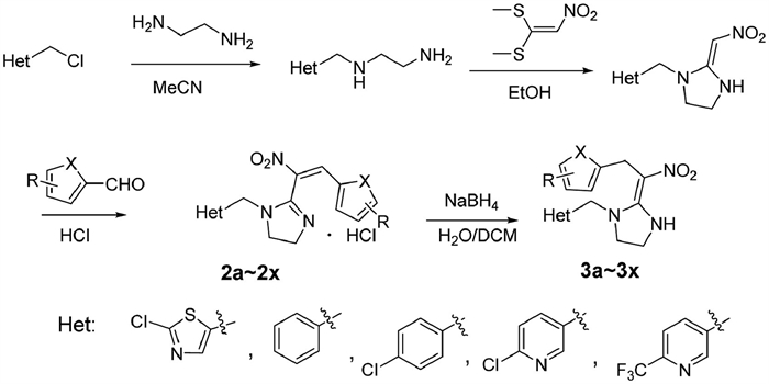 Inspired by the stability and activity of cycloxaprid and other nitromethylene neonicotinoids, we next switched our focus to modification of the nitroconjugated double bond of compound 2 into β-nitroenamine in order to maintain its activity and at the same time enhance the stability. According to the reaction reported by Francisco et al. in 2007 [19], sodium borohydride was employed to selectively reduce the conjugated diene system for improved stability (Scheme 1). In addition, the insecticidal activity was expected to be even improved. Twenty-four novel nitromethylene neonicotinoids were synthesized and their significant insecticidal activities and increased stabilities were reported herein.