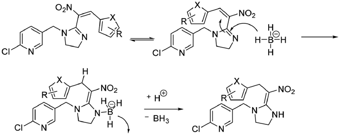 Synthetic route of 3a-3x was shown in Scheme 2 or Fig. S1 (Supporting information). The key to prepare the target compounds was the selective reduction of conjugated diene system. Sodium borohydride can hydrogenate the double bond, which consists of C and hetero atoms like O or N. Sodium borohydride may add to C=N bond and then the C-4 was subsequently protonated to get the target compound (Scheme 3). When the five-membered aromatic ring was substituted by electron-withdrawing group such as nitro group or cyano group, the reduction reaction was unsuccessful.
