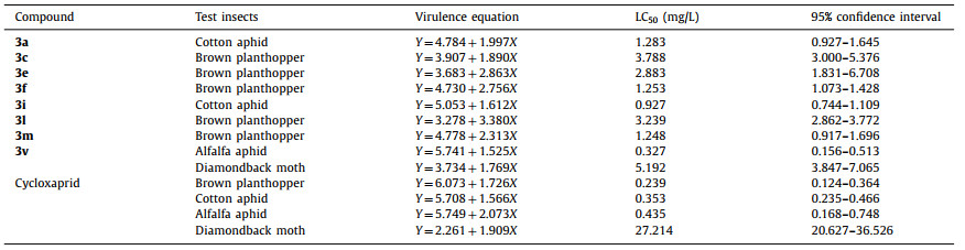 As biological test results shown in Table 2, almost all compounds were active to rice brown planthopper in concentration of 500 mg/L, and mortality of some compounds could reach 100% even in the concentration of 4 mg/L. Most compounds were active against aphid at 500 mg/L. Some compounds could keep 100% mortality in 4 mg/L. However, this series of compounds show poor activity against the diamondback moth except 3v.