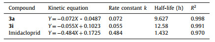We selected two representative compounds 3a and 3i to test their photo and water stability due to their good activity and imidacloprid was chosen as control. The degradation kinetics of 3a and 3i were calculated by the residues of peak area versus time. The relative concentration of 3a and 3i fitted well to the following pseudo first-order kinetic equation (Eq. 1).