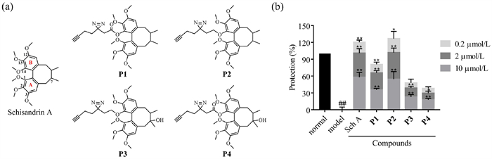 | Fig. 1. Chemical structure and the neuroprotective activity evaluation of Sch A and probes. (a) Chemical structures of Sch A and designed probes. (b) The evaluation of the neuroprotective activity of Sch A and designed probes. Data are presented as mean ± SEM, n = 6 biological replicates per group. Compared with normal group: ##P < 0.01; compared with model group: P < 0.05, **P < 0.01. | |