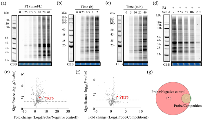 | Fig. 2. Evaluation of the labeling efficiency of probe P2 and target identification of Sch A in living SH-SY5Y cells. Photoaffinity labeling of potential targets in SH-SY5Y cells with probe P2 in various concentrations (a), incubation time (b) and UV light irradiation time (c). CBB = Coomassie staining. (d) Competitive photoaffinity labeling of potential targets in SH-SY5Y cells with probe P2 (10 µmol/L) and excessive Sch A. Volcano plot of enriched proteins in the probe/negative control group (e) or in the probe/competition group (f). Ykt6 is highlighted in red, n = 3 independent experiments per group. (g) Venn diagram showing the number of proteins that were significantly enriched in both pull-down experiments. | |
