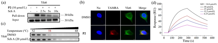 | Fig. 3. Validation of interaction between Ykt6 and Sch A. (a) Pull-down/Western blotting was used to validate the Ykt6 with probe P2 and Sch A. (b) IF confocal imaging of SH-SY5Y cells with P2. Immunofluorescence (IF) staining using anti-Ykt6 antibodies. Scale bar = 5 µm. Tetramethylrhodamine = TAMRA. (c) Detection of the interaction between Ykt6 and Sch A by SPR. (d) Evaluation of the thermal stability of Ykt6 incubated with Sch A by CETSA. 58 ℃ was the critical temperature of protein thermal denaturation. | |