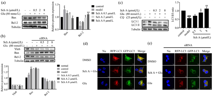 | Fig. 4. Sch A exerts the neuroprotective effect by regulating autophagy through Ykt6. (a, b) Bax and Bcl-2 expression levels both in normal (a) or Ykt6 knock-down (b) SH-SY5Y cells induced by glutamate (80 mmol/L) with or without Sch A detected by Western blotting. (c) LC3 Ⅰ and LC3 Ⅱ expression levels in SH-SY5Y cells induced by glutamate (80 mmol/L) with or without Sch A detected by Western blotting. CQ = chloroquine. Data are presented as mean ± SEM, n = 3 biological replicates per group. Compared with control group: #P < 0.05, ##P < 0.01, ###P < 0.001; compared with model group: P < 0.05, **P < 0.01; compared with normal group: ^P < 0.05, ^^P < 0.01, ^^^P < 0.001. (d, e) SH-SY5Y cells were infected with an RFP-GFP-LC3 expressing adenovirus. Autophagic flux both in normal (d) or Ykt6 knock-down (e) SH-SY5Y cells induced by glutamate (80 mmol/L) with or without Sch A (8 µmol/L) was detected with live-cell imaging microscopy. Scale bar = 5 µm. | |