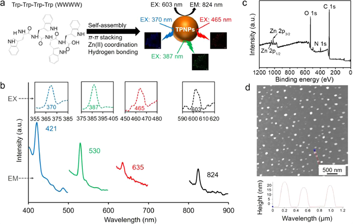 | Fig. 1. Design and synthesis of TPNPs. (a) WWWW was self-assembled with Zn(Ⅱ) to construct TPNPs through π-π stacking, zinc coordination and hydrogen bonding. (b) Multicolor fluorescence emission spectra of TPNPs. (c) XPS survey spectrum of TPNPs. (d) AFM image of TPNPs. | |