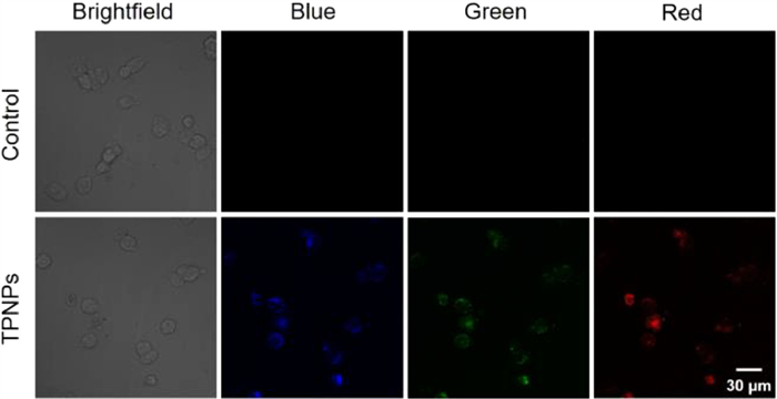 Organic fluorescent dyes DAPI, Rh6G, RhB and ICG were utilized to test the photostability of TPNPs (Fig. S3 in Supporting information). All of the selected organic fluorescent dyes have the corresponding fluorescence to the TPNPs with different emission wavelengths. The photostability were investigated by the fluorescence emission spectrum of TPNPs. The comparative tests of TPNPs and DAPI with 421 nm emission wavelength (Fig. S3a), TPNPs and Rh6G with 530 nm emission wavelength (Fig. S3b), TPNPs and RhB with 635 nm emission wavelength (Fig. S3c), TPNPs and ICG with 824 nm emission wavelength (Fig. S3d) showed that after continuous irradiation for 120 s, the fluorescence intensity of TPNPs remained stable. However, the fluorescence intensity of all the corresponding organic dyes decreased accordingly. This result indicated that TPNPs have a better photostability compared with organic fluorescent dyes. The optical properties of TPNPs demonstrated that TPNPs not only have multicolor fluorescence, but also have a high photostability, highlighting its potential for bioimaging. Furthermore, the stability of TPNPs in DI water, PBS, and culture medium was tested (Fig. S4 in Supporting information). After 24 h, the fluorescence still could be observed and the relative intensity were all higher than 50%. The result showed that the structure of TPNPs is stable.