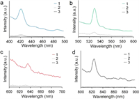 | Fig. 3. Optical characterizations of TPNPs. The emission wavelength of TPNPs synthesized under different conditions at an excitation wavelength of 370 nm (a), 387 nm (b), 465 nm (c) and 603 nm (d): (1) WWWW self-assembly with Zn(Ⅱ) after heating, (2) WWWW self-assembly with Zn(Ⅱ) at room temperature, (3) WWWW self-assembly without Zn(Ⅱ) at room temperature. | |