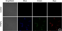 | Fig. 4. Confocal fluorescence images of MCF-7 cells incubated with TPNPs after 3 h. The excitation wavelengths are 370 nm (blue fluorescence), 387 nm (green fluorescence) and 465 nm (red fluorescence). | |