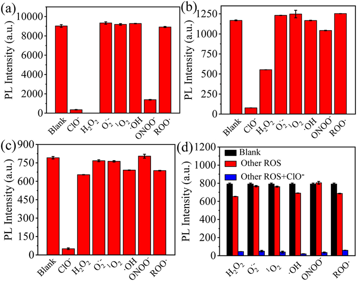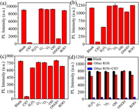 | Fig. 1. Fluorescence responses of (a) DHIP-CO2Me, (b) DHIP-Me and (c) DHIP-Py toward different ROS (100 µmol/L, 10 equiv.). (d) Fluorescence responses of DHIP-Py toward ClO– in the presence of other ROS. | |