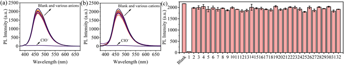 To further confirm the selectivity of DHIP-Py toward ClO– in complicated actual sample, we investigated the effects of various common cations (Na+, Al3+, Ba2+, Ca2+, Cu2+, Cr3+, Co2+, Cd2+, Mg2+, Hg2+, Fe3+, Zn2+, Pd2+, Ni2+, Mn2+, Ag+) and anions (Ac–, F–, Br–, Cl–, I–, CO32–, HCO3–, H2PO4–, HPO42–, PO43–, NO2–, S2–, SCN–, SO32–, SO42–) on ClO– sensing in PBS buffer (pH 7.4, 10 mmol/L). Likewise, DHIP-Py was treated with 10 equiv. analytes, respectively. Mixed well and scan the fluorescence spectra within 1 min. As shown in Fig. 2, none of the testing species caused a remarkable decrease in fluorescence as ClO– did. This phenomenon illustrates that DHIP-Py-based sensing system has good selectivity for ClO–, indicating its potential applications in complex samples.