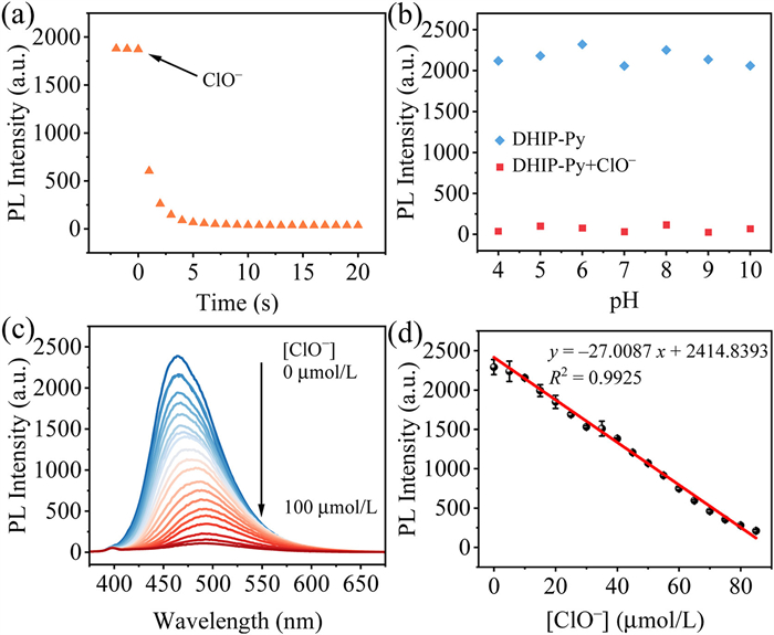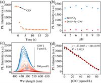 | Fig. 3. (a) Time-dependent and (b) pH-dependent fluorescence response of DHIP-Py (10 µmol/L) toward ClO− (10 equiv.). (c) Fluorescence spectra changes of DHIP-Py (10 µmol/L) upon addition of increasing amount of ClO− (0~100 µmol/L) in PBS (pH 7.4, 10 mmol/L). (d) Linear relationship between fluorescence intensity at 465 nm of DHIP-Py (10 µmol/L) versus concentrations of ClO−. | |