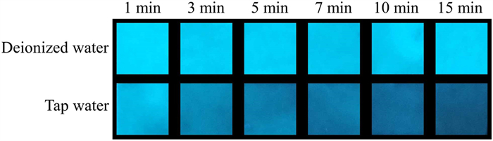 | Fig. 4. Fluorescence images of DHIP-Py-treated filter papers immersed in tap water or deionized water for different times. | |