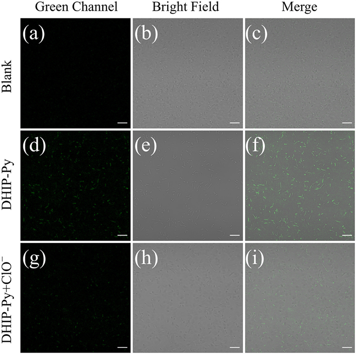 | Fig. 5. Confocal fluorescence images of E. coli (a–c) stained with 20 µmol/L DHIP-Py for 45 min (d–f), and then further treated with 5 equiv. ClO− (g–i) for another 20 min. λex = 405 nm, λem = 410–554 nm. Scale bar: 10 µm. | |