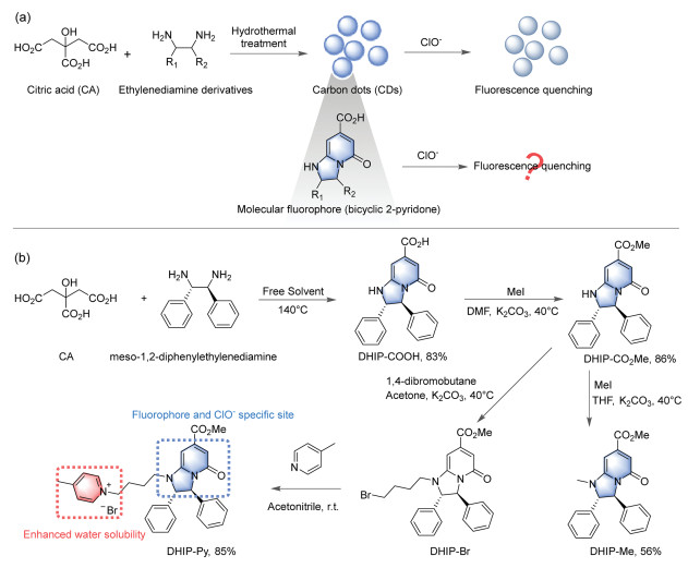 | Scheme 1. (a) The molecular scaffold of ClO– probes inspired by ClO–-responsive carbon dots synthesized from CA and ethylenediamine derivatives; (b) The synthetic scheme and structures of DHIP series probes. | |