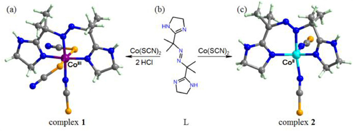 | Fig. 1. Synthesis scheme and crystal structures of complexes 1 and 2. (a) Crystal structure of complex 1. (b) Chemical structure of azo ligand L. (c) Crystal structure of complex 2. (C: gray, N: blue, S: orange, H: light green, CoⅢ: violet, CoⅡ: turquoise). | |