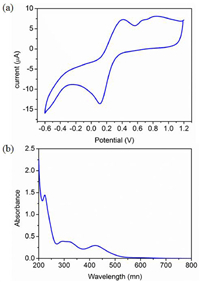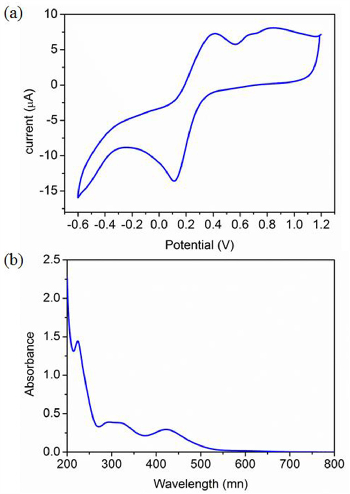 | Fig. 2. (a) Cyclic voltammogram of 0.5 mmol/L complex 1 in acetonitrile and (b) absorption spectra of 0.5 mmol/L complex 1 in acetonitrile. | |