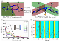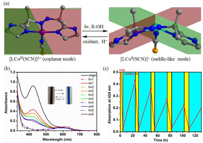 | Fig. 3. Redox reaction driven mechanical motion of the Co switch. (a) Interconversion between two conformations of [LCoⅢ(SCN)]2+ (coplanar mode) and [LCoⅡ(SCN)]+ (saddle-like mode). (b) UV–vis absorption for photo-reduction (hv) of [LCoⅢ(SCN)]2+ and DBAD oxidation (ox) of [LCoⅡ(SCN)]+. (c) Reversible conversional cycles between the CoⅡ and CoⅢ species. | |