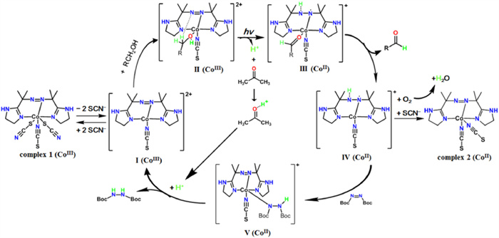 Based on the above observations, we deduced that the redox switching driven by alcohol oxidation and DBAD reduction is a metal-ligand cooperative mediated process [40], and the plausible mechanism is outlined in Scheme 1. Initially, two SCN− anions on the axial positions escape from complex 1 leading to the active species [LCoⅢ(SCN)]2+ (Ⅰ), which binds to an alcohol molecule forming {[LCoⅢ(SCN)]RCH2OH}2+ (Ⅱ) as observed by HR-ESI-MS (Fig. S8). Upon photo-excitation, alcohol provides an electron to the CoⅢ center and releases a proton, and then PCET from the activated alcohol to the coordinated azo-ligand occurred forming a monohydride intermediate species [HLCoⅡ(SCN)RCOH]+ (Ⅲ). This step is evidenced by the observation that a proton acceptor (tetrabutylammonium hydroxide or acetone) is necessary for the redox cycle. The intermediate species (Ⅲ) releases the generated aldehyde forming species Ⅳ, which can facilely donate the H atom on the hydrazine group to DBAD forming [LCoⅡ(SCN)(H-DBAD]+ (Ⅴ). After that, an electron transfers from the cobalt center to the H-DBAD under an acidic surrounding producing the corresponding hydrazine and [LCoⅢ(SCN)]2+ as evidenced by the fact that an azo ligand is necessary to oxidize the CoⅡ species. On the other hand, the species Ⅳ also provides a H atom to dioxygen and captures a SCN− anion generating complex 2 which is proven by the isolation of crystals of complex 2 by photo-irradiation of complex 1 in alcohol.