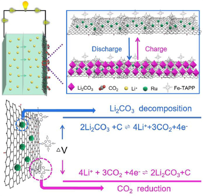 | Fig. 1. The schematic representation of Ru/Fe-TAPP@GO and their effect as cathode catalyst in Li-CO2 battery. | |