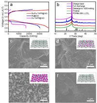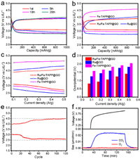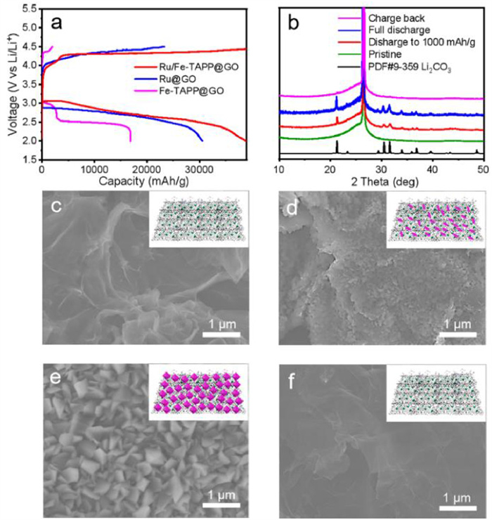 | Fig. 4. Products characterizations of battery reactions. (a) Deep discharge-recharge curves of Ru/Fe-TAPP@GO, Ru@GO and Fe-TAPP@GO cathodes with a limited voltage range of 2.0–4.5 V vs. Li/Li+ at 100 mA/g. (b) PXRD patterns of Ru/Fe-TAPP@GO based electrode at different stages. (c) SEM image of Ru/Fe-TAPP@GO based electrode. (d) SEM image of discharge 1000 mAh/g at 100 mA/g. (e) SEM image of full discharge. (f) SEM image of charge back. | |