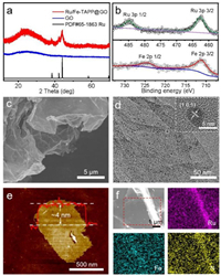 | Fig. 2. Characterization of Ru/Fe-TAPP@GO hybrid NSs. (a) PXRD patterns of Ru/Fe-TAPP@GO and GO. (b) XPS analyses of Fe and Ru for Ru/Fe-TAPP@GO. (c) SEM image of Ru/Fe-TAPP@GO. (d) TEM images of Ru/Fe-TAPP@GO. (e) AFM images of Ru/Fe-TAPP@GO. (f) Elemental mapping images of Ru/Fe-TAPP@GO. | |