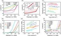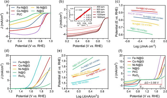 | Fig. 2. Electrocatalytic activities of M-N@Gs for ORR and OER. (a) LSV curves of M-N@Gs and N@G for ORR in 0.1 mol/L KOH at 1600 rpm. (b) LSV curves of Co-N@G for ORR at different rotation rates in rpm. Inset is the corresponding K-L plots at different potentials including the calculated number of electron transfer (n). (c) Tafel slopes derived from (a). (d) LSV curves of different catalysts for OER in 0.1 mol/L KOH. (e) Tafel slopes derived from (d). (f) LSV curves of different catalysts for both ORR and OER in 0.1 mol/L KOH. | |