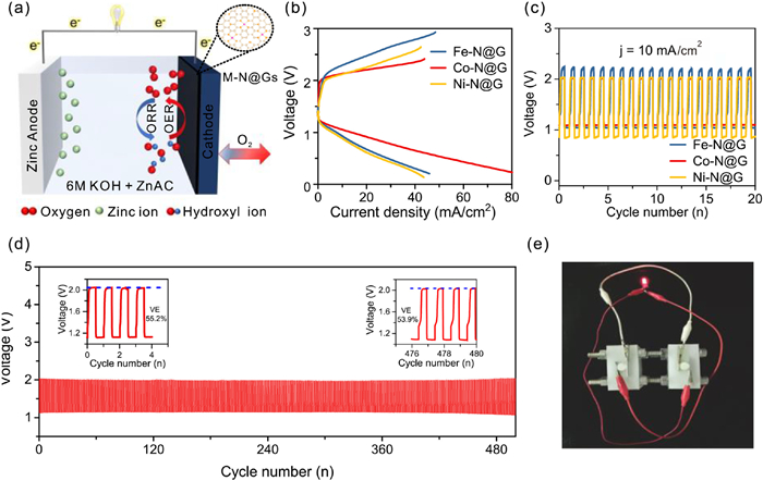 | Fig. 3. Electrochemical performance of Zn-air batteries with M-N@Gs as cathode catalysts. (a) Schematic representation of the rechargeable Zn−air battery. (b) Charge and discharge polarization curves. (c) Galvanostatic discharge–charge cycling curves at 10 mA/cm2 of the rechargeable Zn-air batteries with different catalysts. (d) Long time cycling test at 5 mA/cm2 with Co-N@G as the cathode catalyst. Inset is the voltage efficiency (VE) of Zn-air batteries during the cycling test. (e) Photograph of a red LED (1.8 V) powered by two Zn–air batteries connected in series with Co-N@G as catalysts. | |
