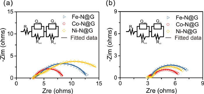 | Fig. 4. Nyquist plots obtained by EIS of the zinc−air batteries with Co-N@G, Fe-N@G and Ni-N@G as catalysts during battery (a) discharging at 1 V and (b) charging at 2.3 V, respectively. Inset is the equivalent circuit. | |