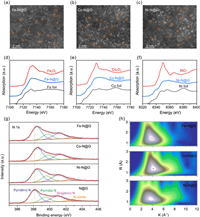 | Fig. 1. Structure characterizations of M-N@Gs. (a–c) HAADF-STEM images of Co-N@G, Fe-N@G and Ni-N@G. (d–f) The experimental K-edge XANES spectra of M-N@Gs with their reference samples (metal foil and metal oxide). (g) High resolution N 1 s XPS spectra of M-N@Gs and N@G. (h) Wavelet transforms for the k2-weighted EXAFS signal of M-N@Gs. | |