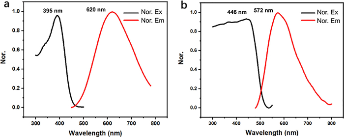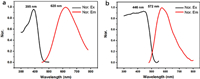 | Fig. 3. Excitation and emission spectra of TPE-Zn4 (a) in DMSO solution and (b) solid-state. | |