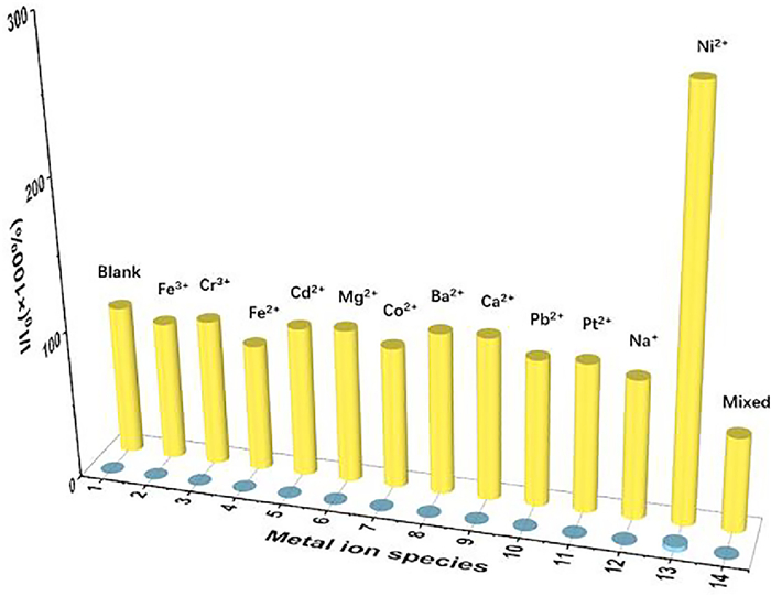 The fluorescence of TPE-Zn4 was affected by zinc ions, indicating that the luminescence of the TPE-Zn4 will be changed by replacing the zinc ions with other metal ions. Thus, we tested a series of metal ions to understand the effect of metal ions on the luminescence behaviour of TPE-Zn4. In a typical experiment, the TPE-Zn4 was dissolved in DMSO at a concentration of 2 × 10−4 mol/L. Then, 2 equiv. of Pd2+, Fe3+, Cr3+, Fe2+, Cd2+, Mg2+, Co2+, Ba2+, Ca2+, Pb2+, Pt2+, Na+ and Ni2+ were added into this DMSO solution of TPE-Zn4, respectively, and their emission spectra were recorded at room temperature. It was found that the emission intensity of TPE-Zn4 did not change significantly after adding Fe3+, Cr3+, Fe2+, Cd2+, Mg2+, Co2+, Ba2+, Ca2+, Pb2+, Pt2+, Na+ (Fig. 4, yellow columns 2–12), while Pd2+ quenched its fluorescence (> 99%, Fig. 4, column 1). These results indicated that TPE-Zn4 had a good sensing selectivity for Pd2+. To further verify the selectivity for Pd2+, 2 equiv. of Pd2+were added into the solutions of TPE-Zn4 presenting with Fe3+, Cr3+, Fe2+, Cd2+, Mg2+, Co2+, Ba2+, Ca2+, Pb2+, Pt2+, and Na+, respectively. The emission measurement showed their fluorescence was immediately quenched by Pd2+ (Fig. 4, blue-grey columns 2–12). Interestingly, Ni2+ ions boosted the emission of TPE-Zn4 (intensity increasing about 2.74-fold, Fig. 4, yellow column 13). However, when the Pd2+ was further added to its solution, its fluorescence was also quenched immediately (Fig. 4, blue-grey column 13). This result further demonstrated that TPE-Zn4 showed high selectivity for Pd2+ions. Moreover, we studied the selectivity of TPE-Zn4 to detect Pd2+ in a solution containing mixed interfering metal ions. A mixture of four different valence metal ions (Fe3+, Zn2+, Na+ and Cr3+) was added to the DMSO solution of TPE-Zn4, and its fluorescence intensity was quenched by about 30% (Fig. 4, column 14). However, when additional 2 equivalents of Pd2+ were added to the mixture solution, the fluorescence was wholly quenched. These results indicate that TPE-Zn4 is an excellent luminescent probe for Pd2+ ions with good antijamming ability.