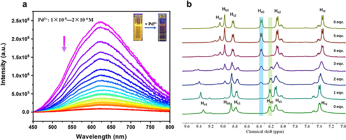 | Fig. 5. (a) Fluorescence titration experiment of TPE-Zn4 (2.0 × 10−4 mol/L) in DMSO solution with the addition of Pd2+. Inset: Fluorescence photographs of TPE-Zn4 under UV light (excited at 365 nm) before and after the addition of Pd2+. (b) 1H NMR titration experiment of TPE-Zn4 in deuterated DMSO with the addition of Pd2+. | |