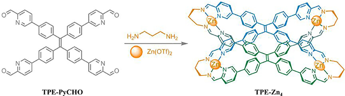 The subcomponent TPE-PyCHO was synthesized by Suzuki coupling of 5-bromopicolinaldehyde with tetraphenylethylenetetraboronic acid-pinacol (see Supporting information for details). Cage TPE-Zn4 was obtained by reacting TPE-PyCHO (2 equiv.), 1, 3-propanediamine (4 equiv.), and Zn(OTf)2 (4 equiv.) in a mixture of solvent (CH2Cl2/CH3CN, v/v = 1:1) at 70 ℃ for 12 h with a high yield (95%, see Supporting information for details). However, when Zn2+ was not presented in the reacting mixture, no organic cage was formed under the same conditions. This result indicates that the Zn2+ plays a structure-direct role in the formation of the quadrangular prismatic cage. Single crystals of TPE-Zn4 suitable for X-ray diffraction were produced by diffusing the ethyl acetate into its DMSO solution.