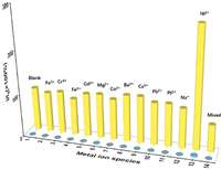 | Fig. 4. Fluorescence intensity of TPE-Zn4 (2 × 10−4 mol/L) in DMSO after the addition of 2.0 equiv. of metal ions (yellow columns) and further addition of 2.0 equiv. of Pd2+ (blue-grey columns). | |