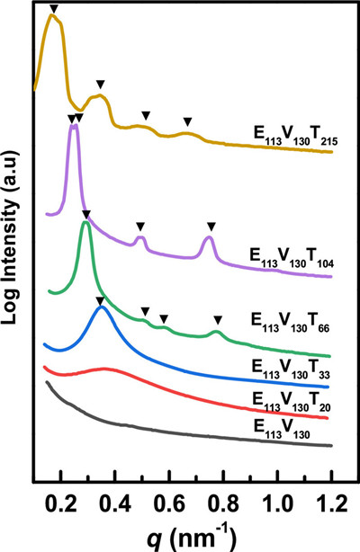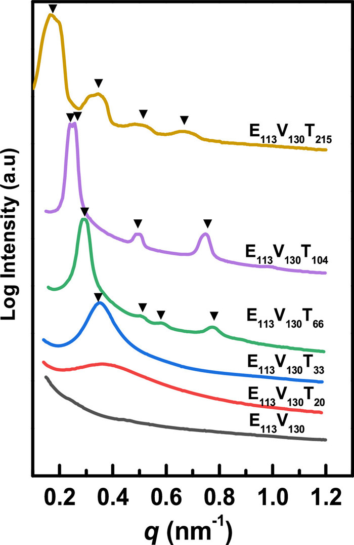 | Fig. 1. SAXS profiles of E113V130T20, E113V130T33, E113V130T66, E113V130T104 and E113V130T215 triblock terpolymers at 30 ℃. | |