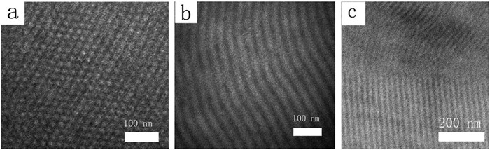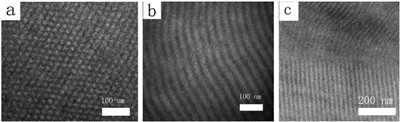 The phase morphologies of E113V130T66, E113V130T104, and E113V130T215 triblock terpolymers were further verified by TEM observation, as shown in Fig. 3. The PEO and PVBC blocks were stained dark with RuO4 and OsO4, respectively. For E113V130T66, the HEX morphology with the smaller PtBS block packing into the interiors of cylinders was observed (Fig. 3a). The domain spacing measured from TEM image was about 20.8 nm, which was close to the value of 21.9 nm calculated by d = 2π/q* from the corresponding SAXS profile. For E113V130T215, the lamellar morphology containing light and dark stripes was observed (Fig. 3b). The domain spacing of LAM morphology from TEM image was about 36.8 nm, which was in good agreement with that of 38.3 nm obtained from SAXS profiles. For E113V130T104, the alternate lamellae perpendicular to the projection of perforated layers without perforations were observed (Fig. 3c). The domain spacing of perforated layers from TEM image was about 26.3 nm, which well agreed with that of 26.3 nm determined from SAXS profiles. However, we were not able to observe the regions where the lamellae were perforated by hexagonally arranged domains. Nevertheless, the TEM images were consistent with the SAXS results.